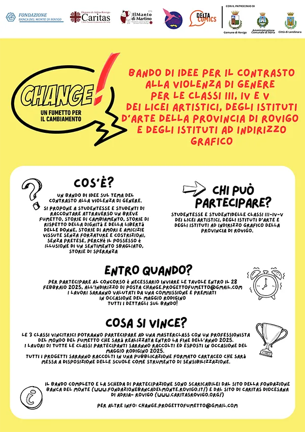 Rivolto a studenti e studentesse delle classi III, IV e V dei Licei Artistici, degli Istituti d’Arte e degli Istituti ad indirizzo grafico della provincia di Rovigo, il bando è frutto del lavoro congiunto di Fondazione Banca del Monte di Rovigo, Centro Antiviolenza del Polesine, Caritas diocesana di Adria-Rovigo, Associazione Il Manto di Martino, con il patrocinio dei Comuni di Rovigo, Adria e Lendinara, in collaborazione con l’Ufficio Scolastico Provinciale e con il supporto della Libreria del Fumetto Delta Comics.