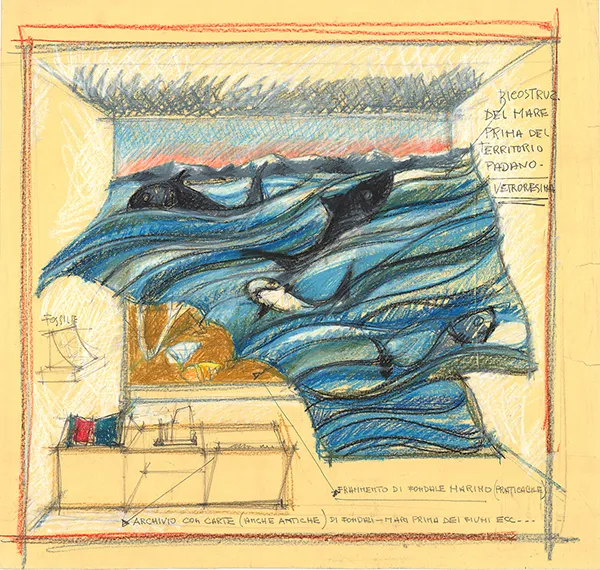 Coinvolgenti sono i disegni per l’allestimento delle sezioni museali, in cui la valorizzazione storico-scientifica dei reperti è compresa in spazi suggestivi, scenograficamente narrativi, resi più accessibili ai visitatori attraverso ricostruzioni di ambienti, di necropoli, di botteghe artigiane. La concezione spettacolare dello spazio di Ferrari, peraltro attivo dagli anni ’80 anche come scenografo in teatro, è evidente anche nei bozzetti per le sezioni del Museo rimaste in pectore, tra i tanti La stanza dei paragoni, La stanza del fuoco, Pianura padana, eseguiti con colori brillanti e tecniche miste come quelle da lui impiegate per realizzare illustrazioni e bozzetti di scenografie teatrali.
